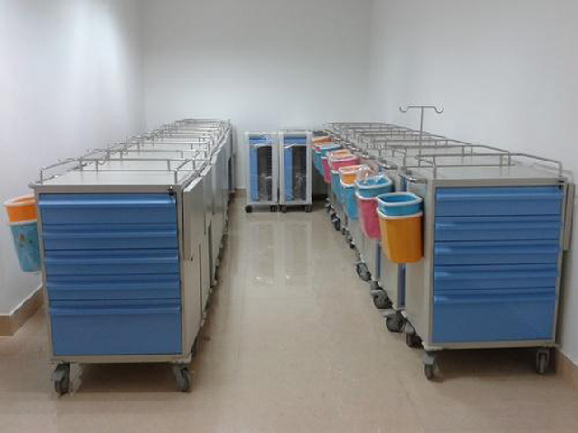 搶救車的基本構(gòu)造是車體、輪子、還有醫(yī)用櫥柜。櫥柜的柜體是放藥品的空格。車體有固定氧氣瓶的套筒。還配有輸液架,還有多個放物品的抽屜。蓋板可以蓋住藥物。采用了塑鋼材料,包含工作臺面,雜物箱,輸液架,輪子,垃圾桶。一般分四個層次,急救藥品區(qū),放置一定數(shù)量的急救藥品,根據(jù)藥品使用頻率來依次排列。輸液區(qū),放了輸液器、注冊器、留置針、止血貼、消毒棉、砂輪、等。呼吸物品區(qū),開口器、壓舌板、吸氧管、各種型號插管喉鏡。其他物品,溫度計、血壓計、電筒、負(fù)壓吸引器等。