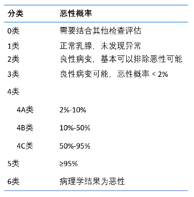BI-RADS系統(tǒng)可分為0-6類。其中0類指醫(yī)生懷疑有惡性可能,但是沒(méi)有從超聲檢查中獲取充分的證據(jù),需要結(jié)合其他檢查結(jié)果評(píng)估。其余1-6類,類別越高,惡性概率越高。各類別惡性概率如下表所示。因此,如果看到自己的報(bào)告單上寫(xiě)著“BI-RADS 1類”或“BI-RADS 2類”,可以稍稍放下心來(lái),定期復(fù)查;如果報(bào)告單上寫(xiě)著0類或3、4、5、6類,則需要及時(shí)前往醫(yī)院就診,請(qǐng)醫(yī)生給出專業(yè)意見(jiàn)。