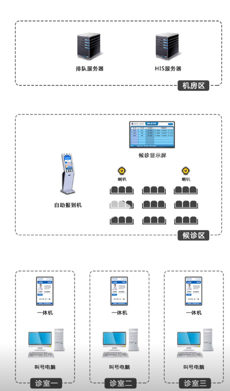排隊(duì)叫號(hào)系統(tǒng)圖,機(jī)房區(qū)由排隊(duì)服務(wù)器和叫號(hào)服務(wù)器組成。候診區(qū)由自助報(bào)道一體機(jī),播放喇叭候診顯示屏組成。診室區(qū)由排隊(duì)叫號(hào)顯示一體機(jī)和呼叫電腦組成,同時(shí)服務(wù)器顯示屏叫號(hào)一體機(jī)都是通過tcp聯(lián)網(wǎng)。