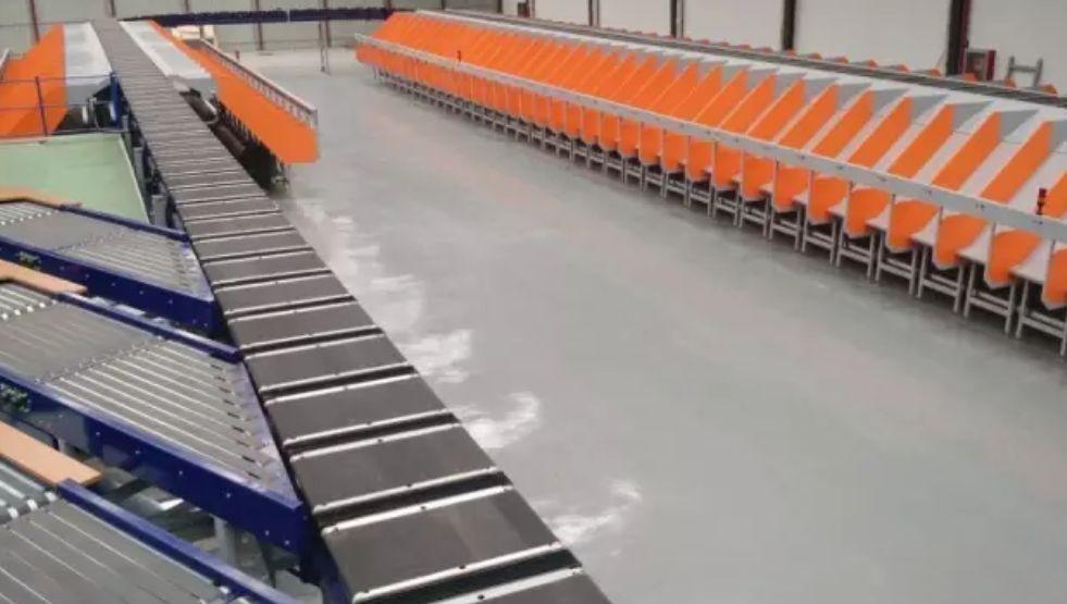 交叉帶分揀機(jī),交叉帶分揀機(jī)有很多種型式,比較普遍的為一車雙帶式,即一個小車上面有兩段垂直的皮帶,既可以每段皮帶上搬送一個包裹也可以兩段皮帶合起來搬送一個包裹。在兩段皮帶合起來搬送一個包裹的情況下,可以通過在分揀機(jī)兩段皮帶方向的預(yù)動作,使包裹的方向與分揀方向相一直以減少格口的間距要求。優(yōu)點(diǎn):噪音低、可分揀貨物的范圍廣,通過雙邊供包及格口優(yōu)化可以實(shí)現(xiàn)單臺最大能力約2萬件每小時。缺點(diǎn):造價比較昂貴、維護(hù)費(fèi)用高。