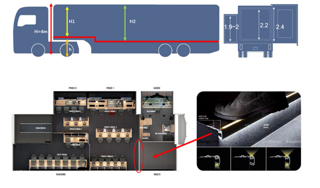 由于國家限定了轉(zhuǎn)播車在行駛中的尺寸,尤其是高度和寬度,無論選用什么車型,寬度都限定在2.55米以內(nèi),因此只有通過增加拉箱來擴(kuò)展使用空間。