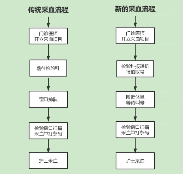 門診醫(yī)師開采血項(xiàng)目>報道機(jī)報道取號>座位休息等待叫號機(jī)叫號>檢驗(yàn)窗口掃描采血單條碼>護(hù)士采血