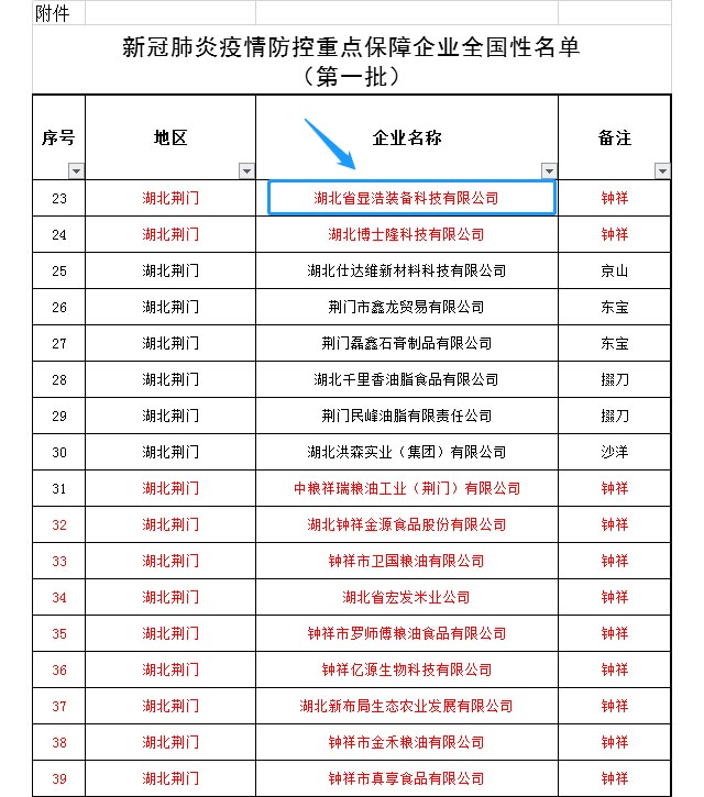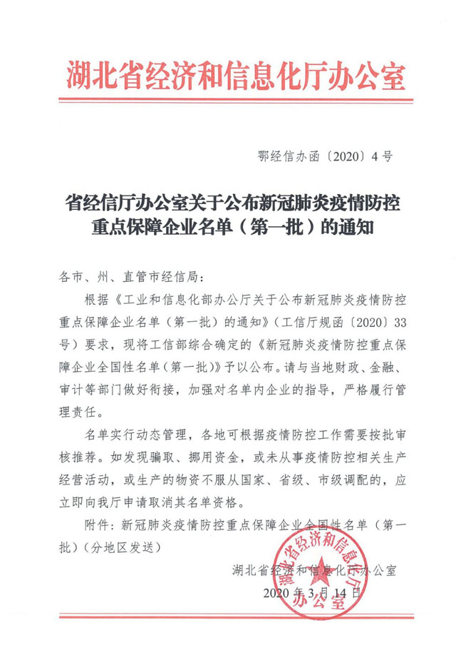湖北省顯浩裝備科技有限公司被省經(jīng)濟和信息化廳列入新冠肺炎疫情防控全國重點保障企業(yè)(第一批)名單。