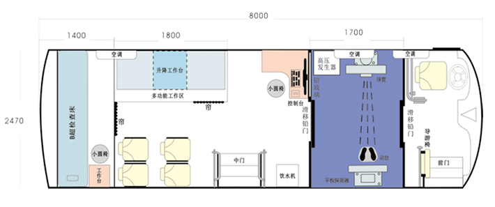 車載DR體檢車功能卻很齊全,車上配裝X光機(jī)、心電超聲檢查、電測聽室、全自動(dòng)生化分析儀以及檢查床、冰柜、空調(diào)和紫外線消毒燈等先進(jìn)醫(yī)療儀器設(shè)備。