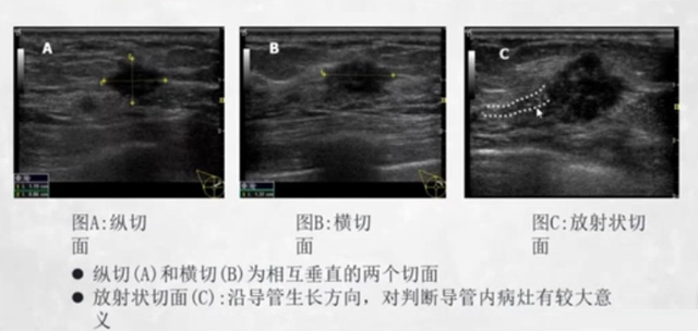 乳腺DR檢查乳腺的縱切和橫切為相互垂直的兩個切面,放射狀切面,也就是以乳頭為中心來進行一個掃查,為什么要強調(diào)放射狀切面呢?可以看到病灶是沿著導(dǎo)管方向的。沿導(dǎo)管生長方向,對判斷導(dǎo)管內(nèi)病灶有較大的臨床意義。檢查留圖要有橫縱切面,放射狀切面。乳腺病灶的定位有兩種方法,一種是以乳頭為中心,經(jīng)過乳頭水平線與垂直線,將乳房分為4個象限,外上下象限,內(nèi)上下象限。另外一種是時鐘定位法,以乳頭為中心,采用12小時鐘點制,病變距乳頭的距離。